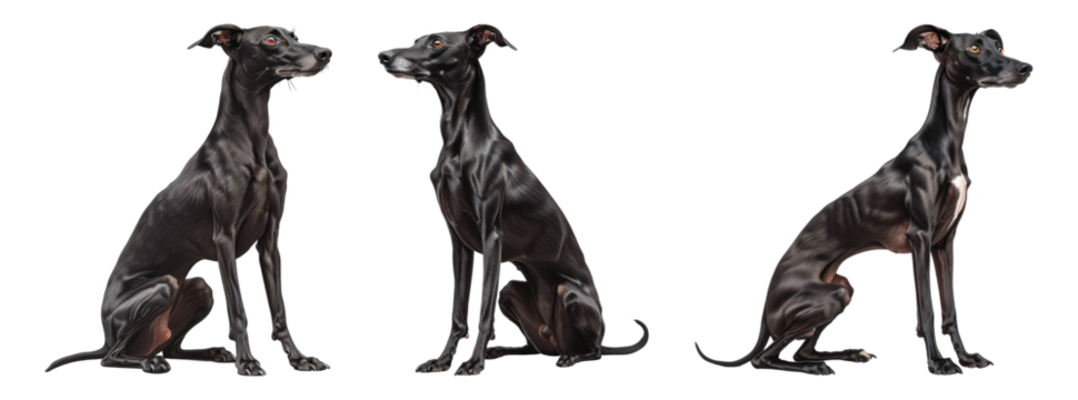 Black Italian Greyhounds in various seated poses showcase their slender build and attentive expressions