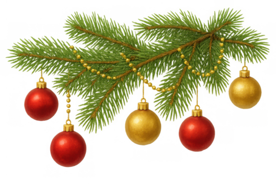 Christmas fir tree branch with red and gold baubles and golden beads garland on transparent background