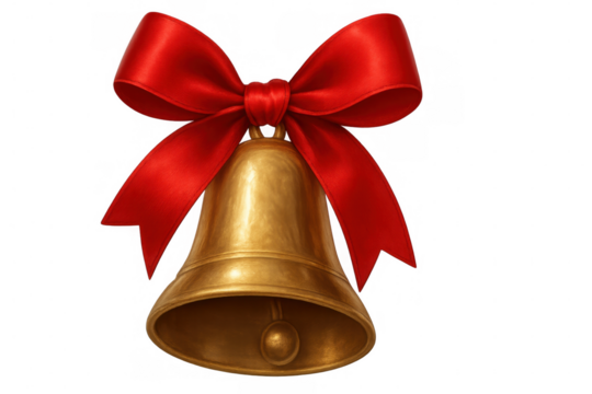 Golden bell with red bow isolated on transparent background, perfect for christmas or festive projects
