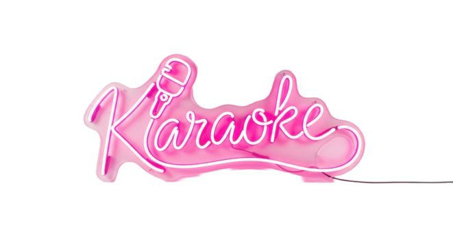 Bright electric pink neon sign reading "karaoke" in elegant calligraphic script with an integrated microphone, glowing intensely against a transparent studio background Concept for entertainment