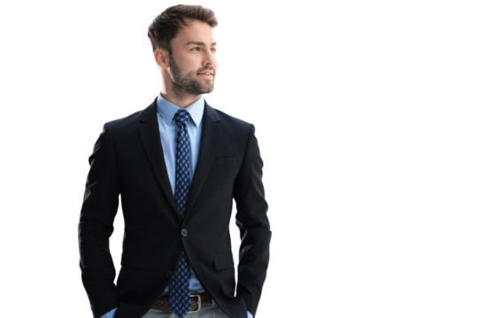 Confident young businessman with beard in navy blue suit and white shirt isolated on transparent background