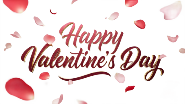Red “Happy Valentine’s Day” elegant text with falling rose petals on white background.