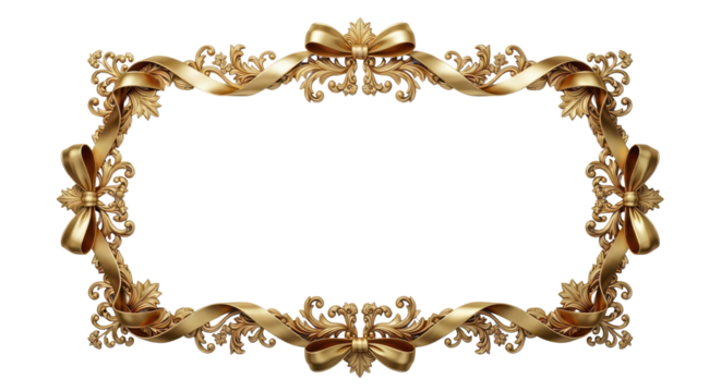 Luxurious Ornate Golden Baroque Frame Border with Ribbons and Decorative Bows isolated PNG with Transparent Background