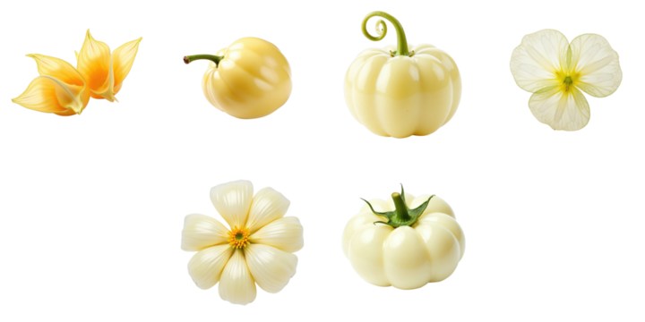 Collection of Delicate White Vegetables and Flowers Featuring Yellow Floral Accents Against a transparent Background for Culinary and Design Use
