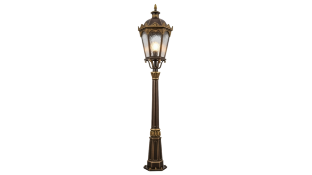 Vintage bronze street lamp PNG isolated on transparent background, ornate outdoor lighting fixture for garden and park decoration