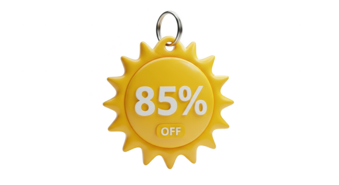 Yellow sun shaped 85 percent off tag isolated on transparent background