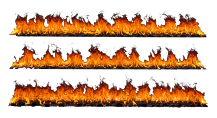 Four vibrant, dancing flame bands with dynamic patterns, fiery particles, and smoke against a transparent studio background, top-down, powerful elemental energy concept
