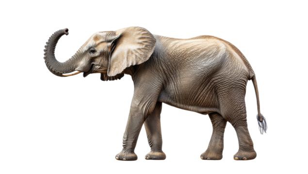 Majestic African elephant with trunk raised on transparent background Side view of a large mammal with detailed skin texture Concept of wildlife, conservation, and safari