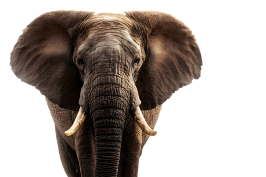 A majestic grey elephant with large tusks and wrinkled skin, standing calmly, isolated on white background .