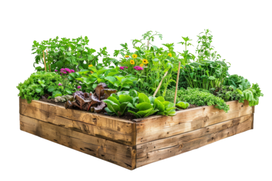 Growing vegetables in a wooden raised bed garden outdoor nature isolated on transparent background