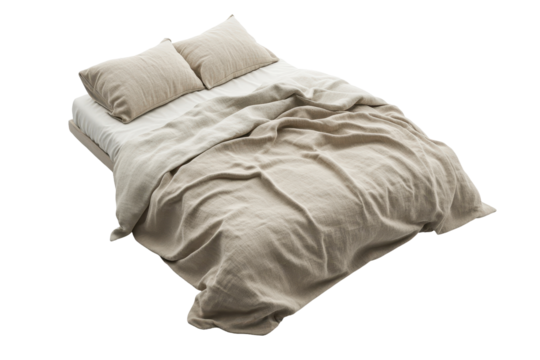 Unmade bed with beige linen sheets and duvet, two pillows, slightly rumpled, elevated on a platform