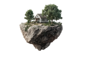 A small, white house sits atop a large, heart-shaped, floating rock island, surrounded by two trees