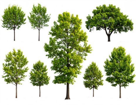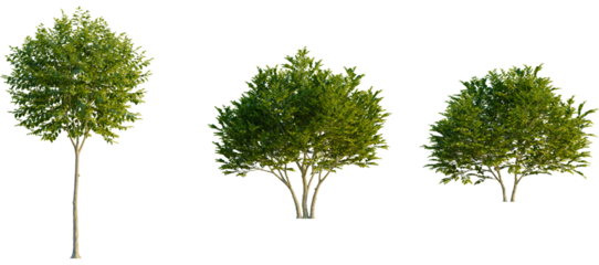 Aphananthe aspera Tree front, elevation view, cutout, isolate, Three small trees with lush green leaves on a transparent background, perfect for design and decoration