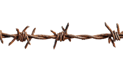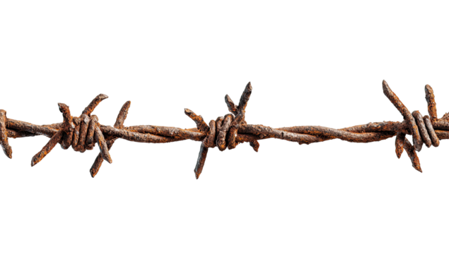 Rusty barbed wire fence strand with sharp points crossing over a second strand, representing boundary, security, or restriction, ideal for themes of exclusion or property lines.