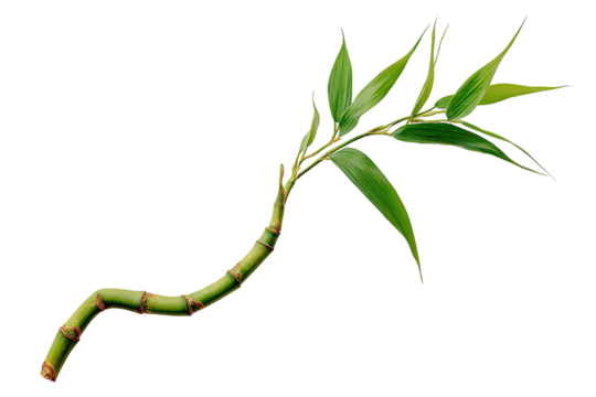 A vibrant bamboo shoot,  with a curved stem and  lush green leaves
