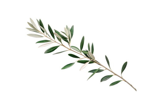 Elegant olive tree branch with elongated leaves in various shades of green and brown natural coloring, isolated on a transparent background