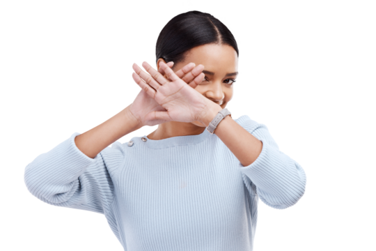 Face, cover and woman hiding, shy and show stop gesture, symbol or emoji icon for confidential, embarrassed or playful. Portrait, palm hands and female person isolated on transparent, png background