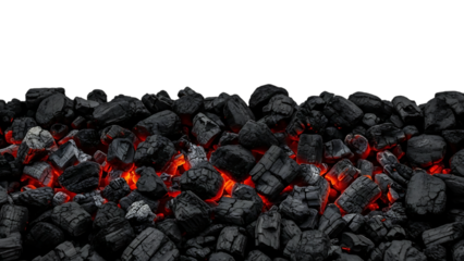 Glowing charcoal embers on a pile of black coals isolated on a transparent background 1