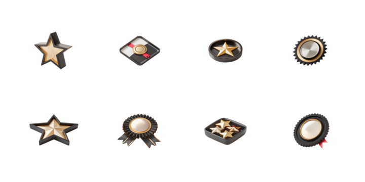 Collection of eight premium gold and black achievement badges icons representing success and ranking on transparent background