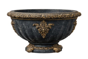 Ornate, dark gray planter with gold accents