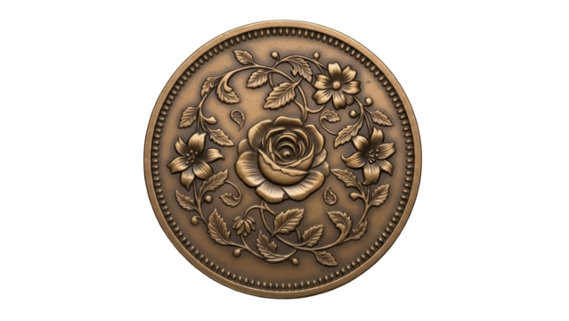 Isolated medallion with rose and flowers, embossed round with floral ornament on coin or token