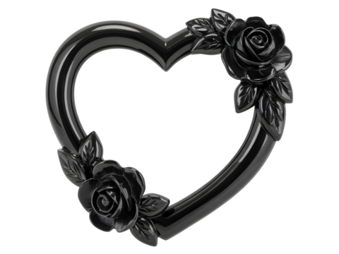 Ornate dark metallic heart shape frame decorated with sculpted roses and leaves isolated on transparent background