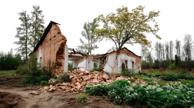 Ruined Building Amidst Serenity: A dilapidated, abandoned building stands as a testament to time and weathering, surrounded by the tranquil embrace of nature, where resilience whispers.