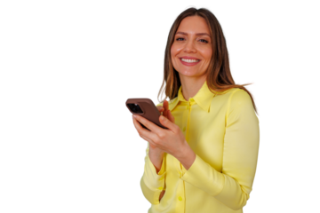 Happy woman using smartphone, smiling at camera, embracing modern communication, digital lifestyle, transparent background