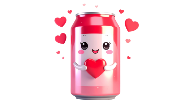 Adorable soda can character with a heart, surrounded by floating hearts, on black