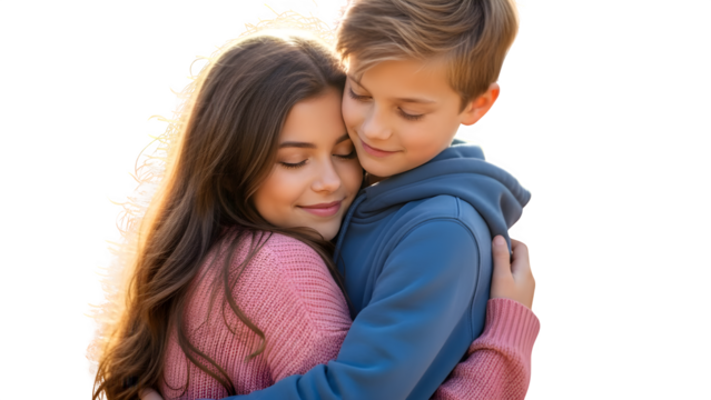 Young Girl and Boy Embracing with Eyes Closed Against Bright White Background