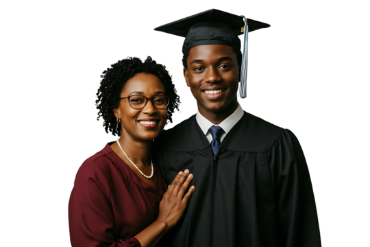 Proud mother embraces her son in his graduation cap and gown, isolated on transparent cutout background, cut out, png