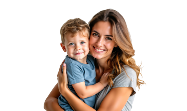 Portrait of a happy mother hugging and having fun with her son, family relationship, isolated on transparent background