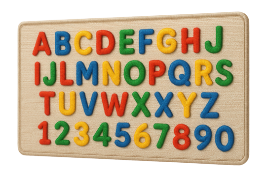 Rectangular rug with embroidered letters and numbers, ideal for a kindergarten classroom setting.