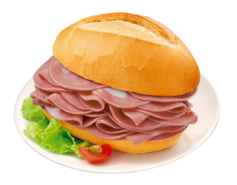 Prato com sanduíche de mortadela fatiada acompanhado de salada isolado em fundo transparente