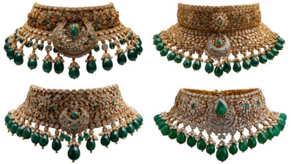 Four ornate indian choker necklaces adorned with emeralds and gold, isolated on transparent background
