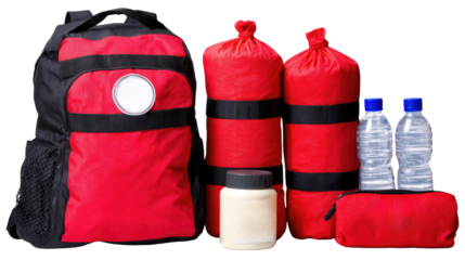 Red Backpack with Gear for Emergency Preparedness, Survival Kit, and Outdoor Adventures