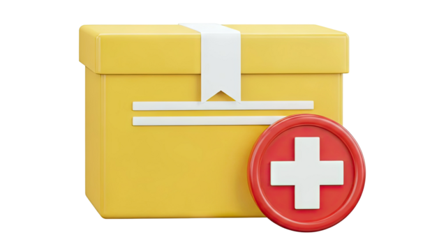Red rectangular object with white cross symbol and metallic edges on black background image