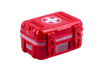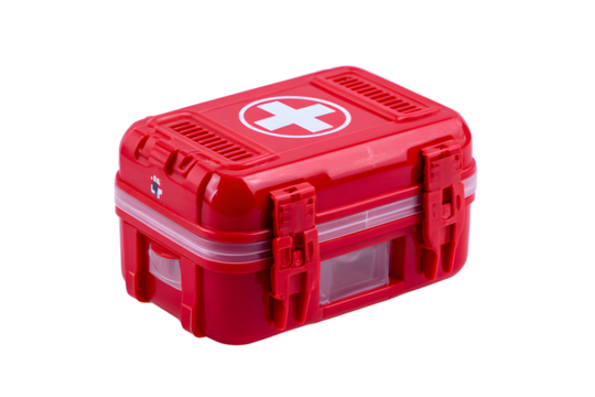 First aid kit in bright red color placed on a clean surface for emergency medical needs and safety preparedness