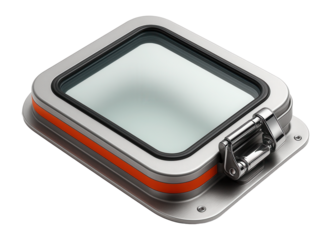 Red emergency box with glass front, industrial design, suitable for safety equipment storage. Ideal for fire safety and emergency preparedness