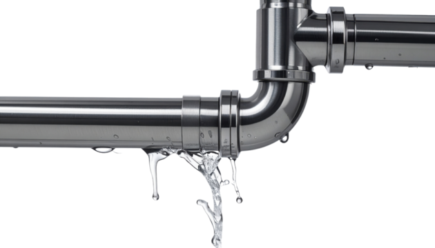 Stainless steel pipe elbow leaking water from a damaged joint, producing a steady stream and dripping droplets.
