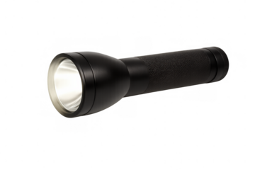 Black tactical flashlight shines brightly illuminating the dark with its powerful beam of light source on transparent background