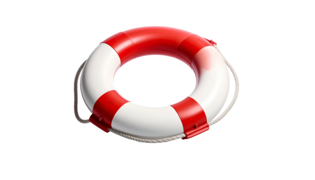 A 3D render of a life buoy, red and white, with rope detailing. It is a buoyant device used in emergencies
