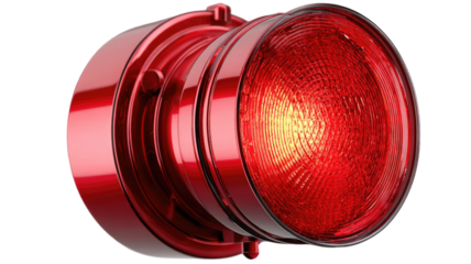 Bright red flashing emergency beacon light with a clear plastic dome and illuminated led bulb isolated on transparent background