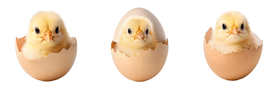 Yellow chick emerging from a cracked egg, isolated on white background. PNG transparent.