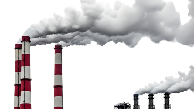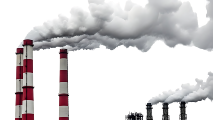 Industrial smokestacks with red and white stripes emitting smoke isolated on a transparent background