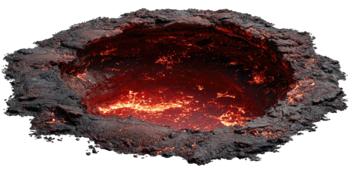 A volcanic crater filled with molten lava, emitting heat, and surrounded by hardened rock