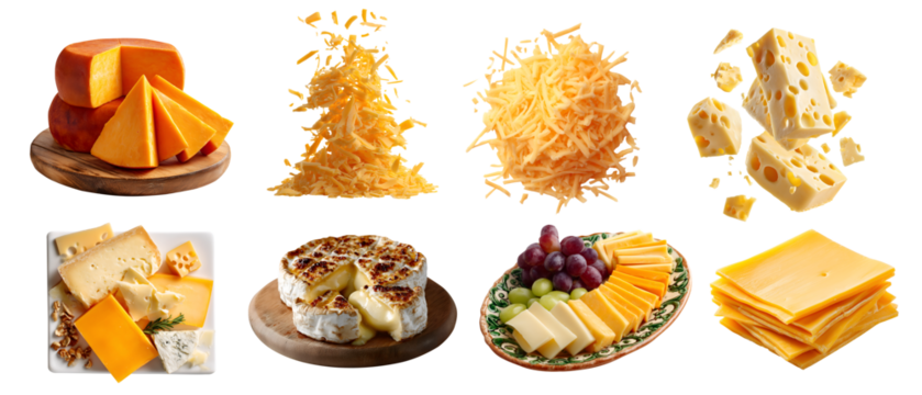 Set of cheese, coagulated dairy milk slices pieces halved, serving board, platter plate. Cheddar, mozzarella, grated, blue, Parmesan, transparent cutout PNG. Many different flavour texture. Mockup