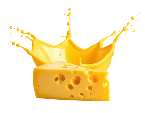 A triangular cheese slice with holes, crowned by a bright yellow splash against black