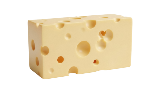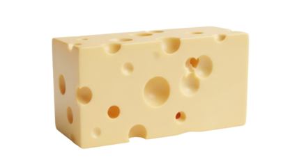 Isolated block of cheese with holes, cheddar style, dairy food, Swiss, close-up, block shape