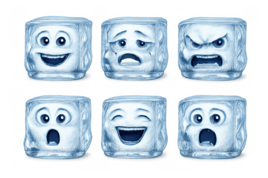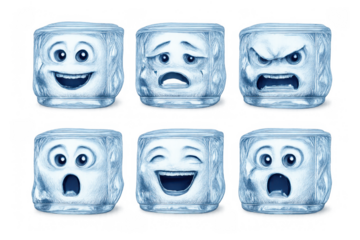 Ice cube character set featuring various facial emotions. Cold, blue frozen cartoon emojis expressing happiness, sadness, anger, and surprise